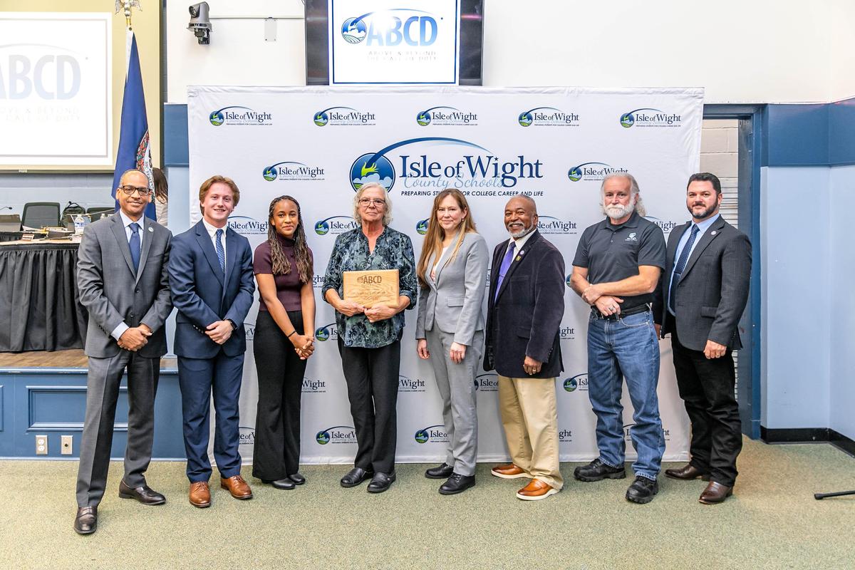 Isle of Wight County Schools (IWCS) recognizes a support staff member each quarter who has gone Above and Beyond the Call of Duty (ABCD). At the November School Board meeting, the division recognized first quarter honoree Jeanne Coleman, Bus Driver for Carrsville ES, GTMS & WHS. Her nomination highlighted how she makes every ride on Bus #30 a safe, joyful, and caring experience, and goes above and beyond as a driver, mentor, and community leader who supports students and families with unwavering dedication. As part of her award, Ms. Jeanne received a $50 Amazon gift card from our partners at Delta Graphics, and a personalized plaque created in the Smithfield High School Maker Space.